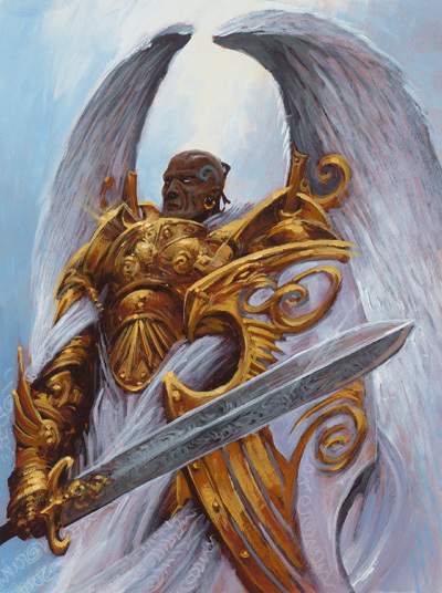看上去很像是一个高大,英俊的有着长长的布满羽毛的羽翼人类,这个生物穿着着优雅的白色礼服并装备着白色的胸甲。