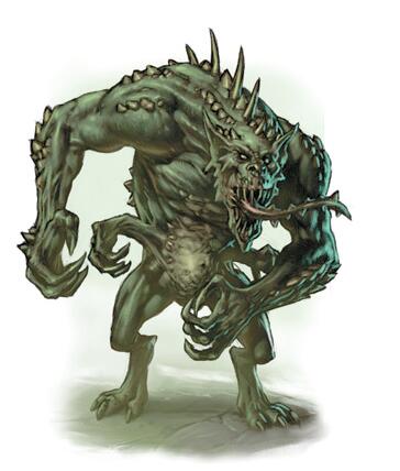 这种生物有着七尺的身高,浅紫色的肢体和护甲般结实的肌肉。它靠着瘦长结实的双腿站立着,一对巨大的手臂和被一张布满硬质利齿的大嘴所分开的硕大头颅导致的绝对重量使得它驼着背。在腹部萌生出的是它的第二对爪状的手臂,细长如同它的主手臂一般且肌肉发达。