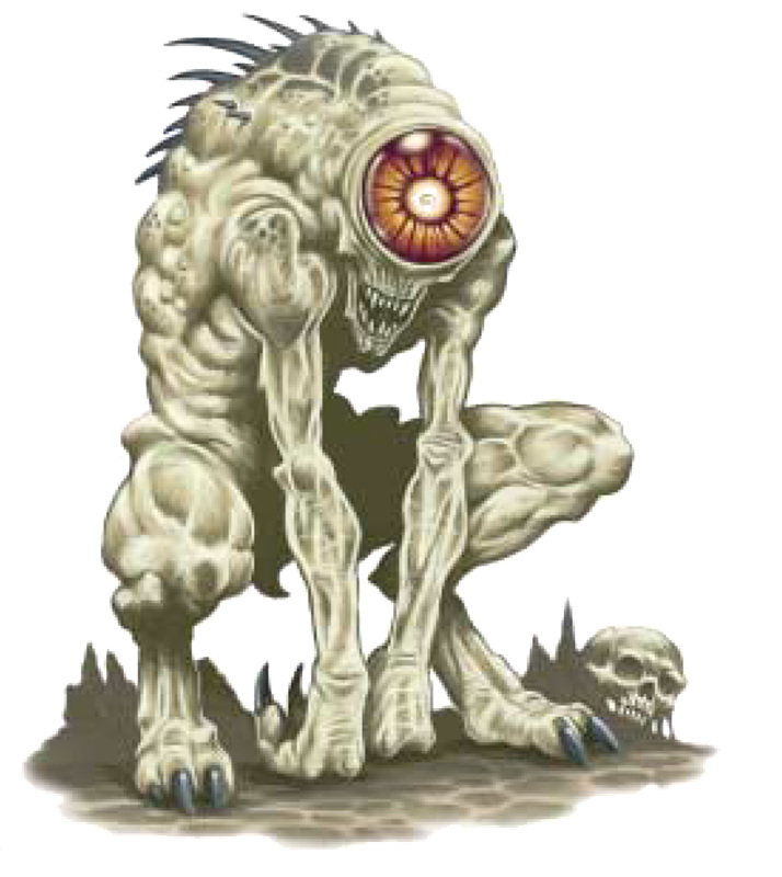 这个脊背隆起的生物拥有一个大到占据了整张脸庞的巨大独眼。它的身体肿胀而且十分的丑陋,它的肢体瘦长但相当强健。它的手臂末端是垂至地面的爪子因此它只能笨拙的跳跃前行。