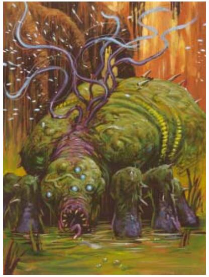 第一眼看上去会以为它是某种湿润的沼泽植物,但很快就会发现其实它是一种丑陋的,长着六条腿的矮壮生物。它的头部瘤状向前突出,大部分被嘴巴占据,沿着它的背部长着众多闪烁着电火花的触手。
