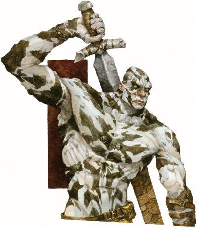 有着粗糙的灰色皮肤和石头样的体躯,这个生物看起来像是石头雕刻成的强健人类。一把惊人巨大的巨剑挂在它的肩膀上,映衬着其粗糙崎岖的肌肉。