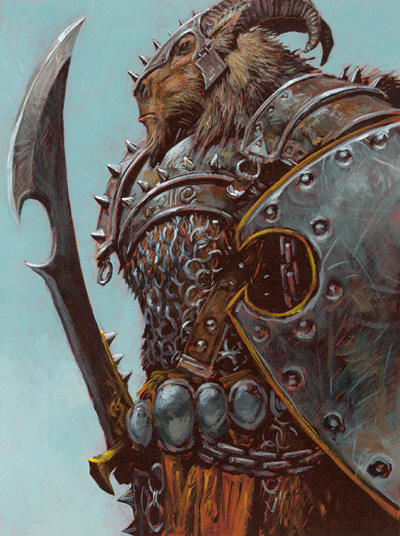 这个高傲的肌肉发达的生物站立时有9尺高。它有着类人生物的躯体,以及强大的长着角的公羊一样的脑袋。它穿着着闪亮的着重装饰的护甲以及装备着打造精良的武器。