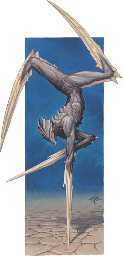 一个灰白色的人形在空中翻转着,你只能勉强看出这是一个人形生物,因为它旋转的速度实在太快了。它用一根根如刀刃一般的附肢不断单脚跳着,如车轮一般转动-时而靠腿,时而靠手臂站立在地面上。最后,它停了下来,停在你面前,你看到了一个苗条的,大约有八英尺高的有着灰白色皮肤的人形,它有一张没有嘴的脸,生着一对空洞的黄色眼睛。它的手臂和腿则从膝部和肘部开始变成了剑刃。