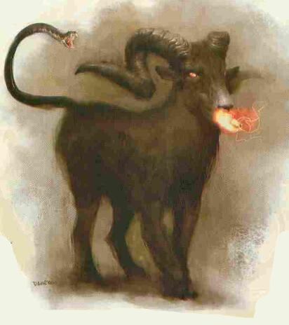 一头有着黑色毛皮,长着弯曲的山羊角的生物低下了头向你冲来。这个生物长着一个山羊的头,却有着一个狼的身体,尾巴则是一条蝰蛇。随着它逐渐奔跑起来,一声尖啸传来,蝰蛇则发出了一阵嘶嘶声。能看到火焰从它生满尖牙利齿的口中不断喷吐出来。