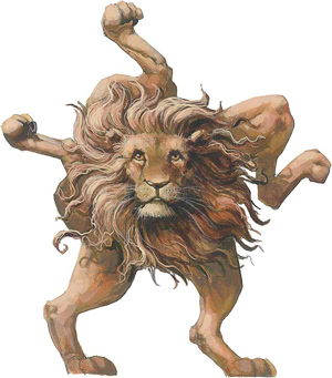 你听到黑暗中传来一阵巨响,就好像有什么在急速的跑动。突然,一只奇怪的生物翻滚着进入了你的视线当中。它好像一个车轮,五条星状分布的狮子的腿构成了轮辐,它不断在你面前变换着面对的方向,你看到这个生物的两面在轴心的位置都是咆哮着的狮子头。