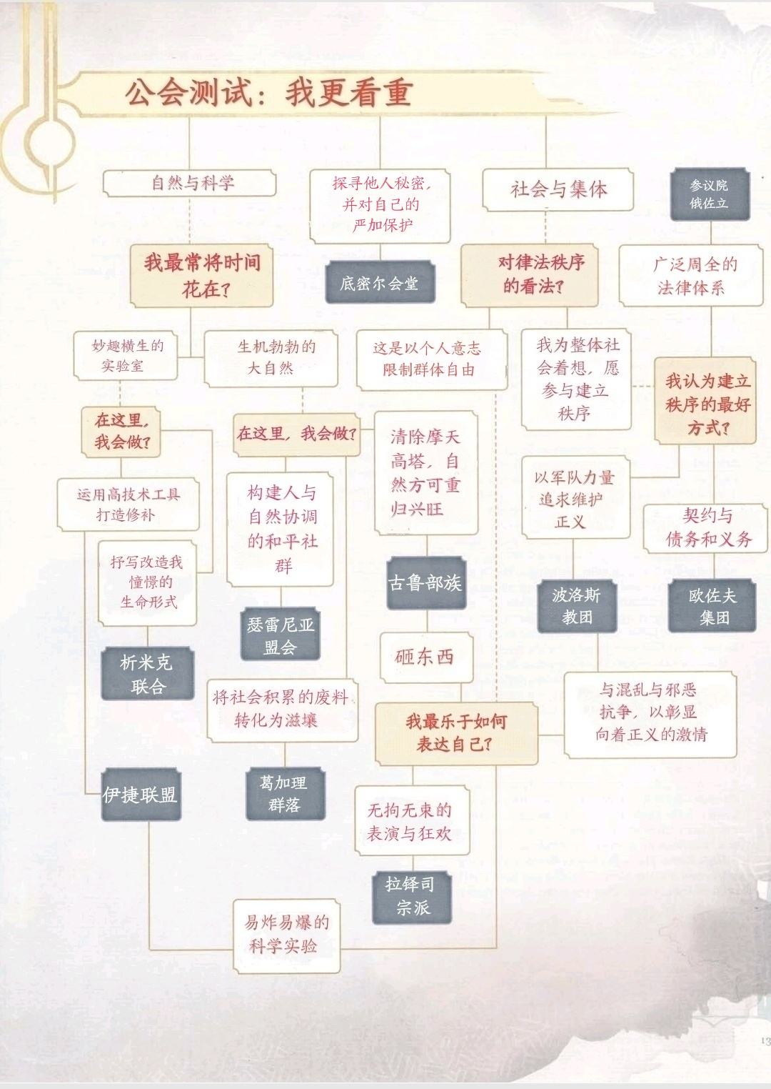 •浏览本章的问卷测试“我更看重?”,其中问题及你的回答会将你引向心怡的公会或是有趣的角色。