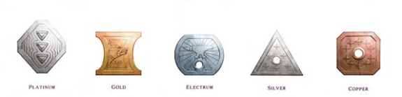 另外,用其他贵重金属制作的货币偶尔也会出现在宝藏中。银金币(ep)和铂金币(pp)发行于衰亡的帝国和失落的王国,它们常常伴随着某些疑虑,有时也会在交易引其对方的怀疑。一枚银金币价值五枚银币,而一枚铂金币价值十枚金币。