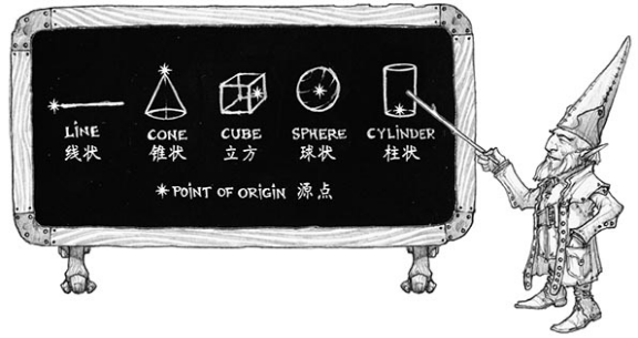 法术的相关描述里会详细说明其效应范围,通常为以下五种形状区域之一:锥状、立方、柱状、线状、球状。效应范围都会有一个爆发魔法能量的源点point