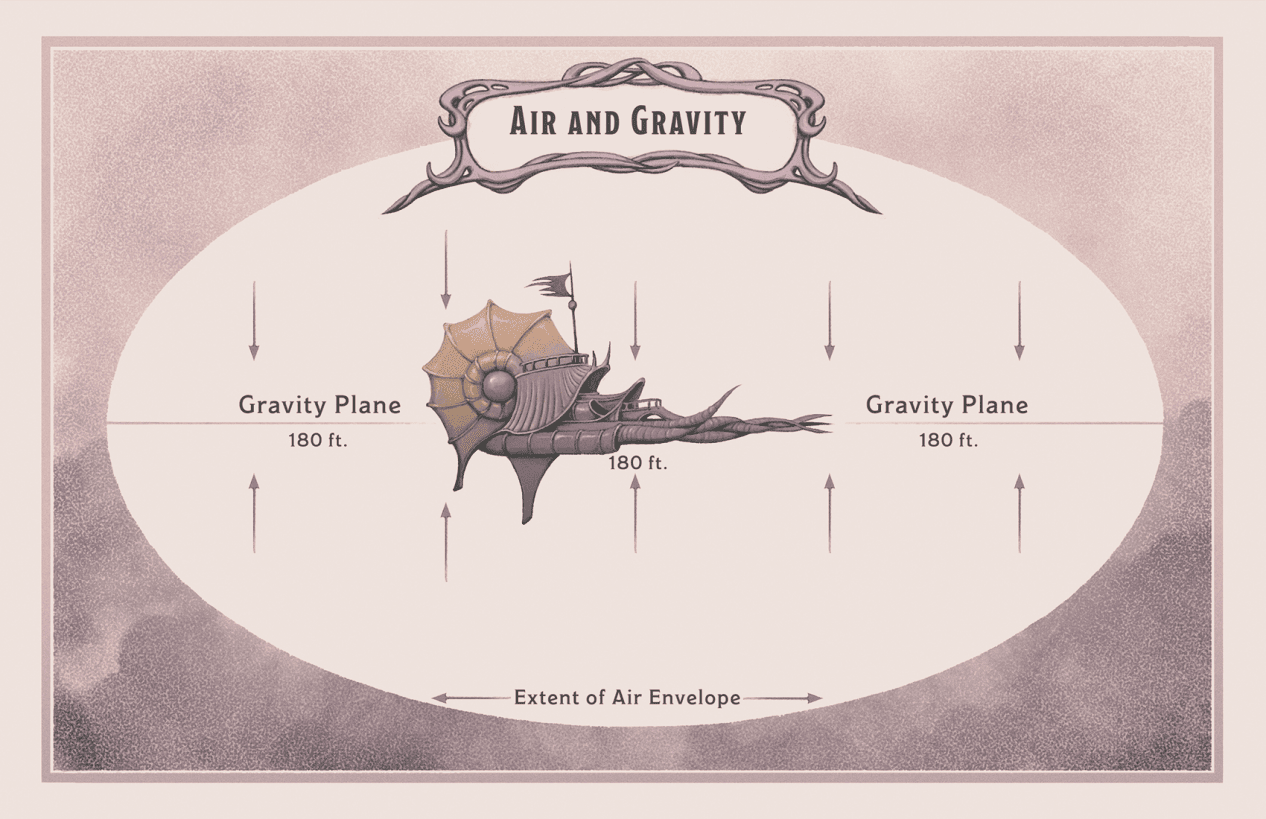 尺的速度漂向气囊的边缘。例如,一个处于昏迷状态的水手或从一艘魔法船的甲板上掉下来的板条箱将开始沿着其重力平面从舰船上漂向舰船气囊的边缘。当它离开气囊时,水手或板条箱将会在舰船驶离时被留在原地。