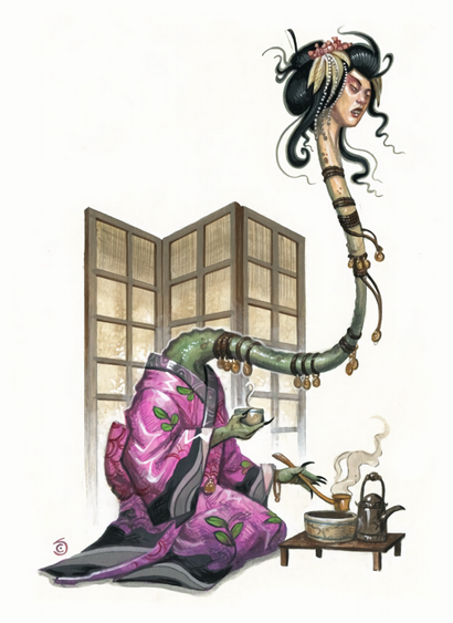 一女素妆,其颈长伸数尺,蜿蜒若蛇。口似血盆,利齿森森如刃在焉。