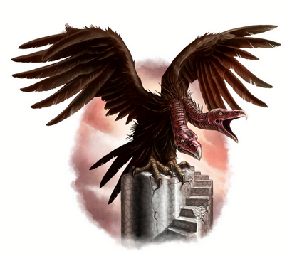 双头鹫是一种凶恶的生物。它与巨鹰很相似,除了看起来更像是秃鹫而不是鹰。它们既捕食活物也吃腐肉,常在沙漠的高空中滑翔以寻找食物。捕食时,它们会避开那些和自身体型差不过或更大的生物,成年双头鹫更喜欢容易抓到的马、骆驼或类人生物,而幼雏则常捕食中、小型的生物。它们体型过大,无法栖息在树上,所以它们的巢穴经常是高山上悬崖边的城堡。很多商队和部落会用一个看起来很弱的落单斥候来引诱饥饿的幼雏进入伏击圈这个办法来猎杀它们以供食用,因此很少有双头鹫幼雏能长到成年。