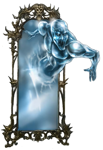 镜中人是异次元的变形者,藏身于镜子后面的半位面中。他通过反光的表面窥视着现世,模拟相貌,然后爬出镜子将牺牲者谋杀并吃掉。他们是变形怪奇怪的变种,抑或是某些制造半位面的怪异法术的副产品已经不得而知,但他们要对许多起谋杀谜案负责,而镜行能力让他们非常难被抓到。
