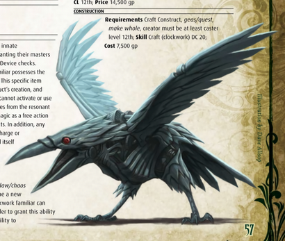 典型的发条魔宠大概2尺高,重约10磅。上面列出的属性是一只发条乌鸦,因此拥有飞行速度,其他的外形可以置换为另外的移动方式,比如发条水虎鱼拥有40尺的游泳速度,或是机械獾可以10尺速度掘进。