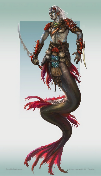 Like their cousins,deep merfolk are highly protective of their tribes and homes and go to great lengths to keep strangers away. Spellcasters among their tribes often use illusions to hide deep merfolk dwellings,while rangers and hunters set up traps,ambushes,and false trails that lead interlopers into distant and dangerous areas of the deep ocean. If such misdirection and illusion fail,deep merfolk don't hesitate to launch proactive attacks against intruders—at a fair distance away from their homes if possible.