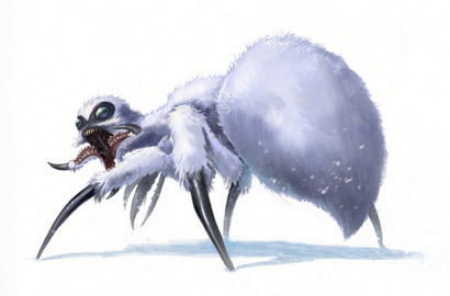 蟹钳毛蛛是危险的捕食者主宰着广阔的极地蛮荒之地。蟹钳毛蛛高塔一般的身躯最高能有25 英尺高,而且由于其细长的腿部使得这种野兽有着与庞大身躯不匹配的惊人速度,身躯的绝大部分是长长的臃肿腹部,长约20 英尺。蟹钳毛蛛胸腔上长有紧凑的前臂,尖端分别有一个巨大的钳子,能够像热刀切黄油一般的划开血肉和骨头。蟹钳毛蛛与众不同的能力是它们那可以分成三瓣的嘴部,打开后可以直接活吞下一个成人。不断咬合的颚钳中会不断流出寒冷粘稠的唾液,能有效的伤害和束缚猎物。由于只有野兽的智力水平,蟹钳毛蛛会将所有比它小的生物视为食物,会毫不犹豫的入侵和吞噬掉整个类人生物的聚居地。