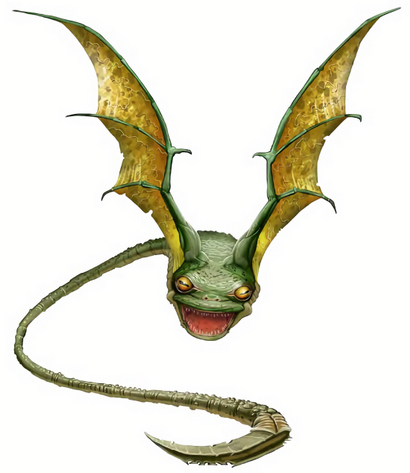 This vicious monster has webbed wings,a mouth full of sharp teeth,and a long tail ending a black stinger.