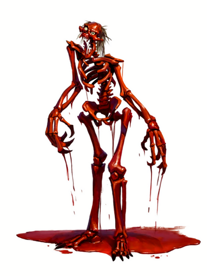 In many lands,parents have used tales of bloody bones to frighten children away from dangerous ponds or to keep them from misbehaving,especially at night. At first sight,these monsters are easy to confuse for particularly gruesome skeletons. Bloody bones,however,have an evil intelligence. They revel in creating fear in their victims,using their natural stealth to haunt and frighten a creature for hours or even days before revealing themselves.