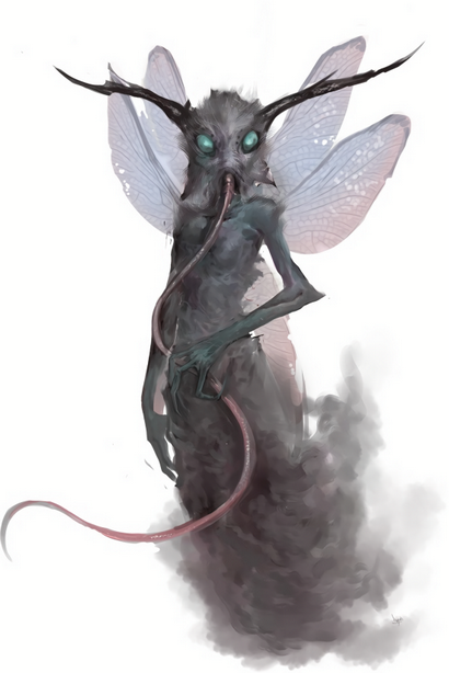 This skeletally thin woman has a mothlike face,flies upon dragonfly wings,and is wrapped in shadows.