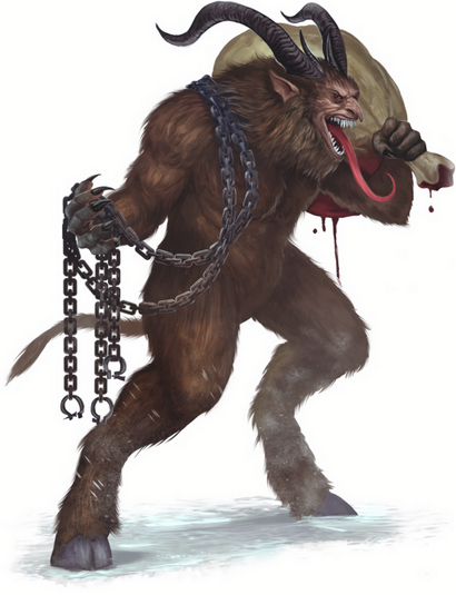 In frigid northern climes,celebrations and festivals are important to maintain a community's morale,especially in the winter months when food is scarce and the days are short. Many of these holidays involve lighting cheery fires,forgiving grudges,decorating trees,and exchanging gifts. Unfortunately,in some areas,these times of merriment are tarnished by the looming specter of Krampus,a terrifying creature that hunts those it considers to be acting against the spirit of the times. However,thanks to Krampus's twisted morality,it sees selfishness and incivility everywhere it goes.