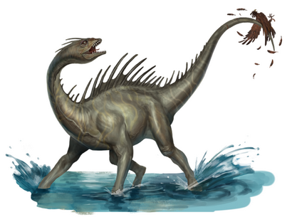 一颗三角形的爬行动物头部从水面上缓缓升起,其嘴里充满了弯曲的牙齿,头部长在蜿蜒的长脖子上。长长的脊刺依次从脖子、背部延伸到鞭状的尾巴,尾巴舒展发出响亮的声音。
