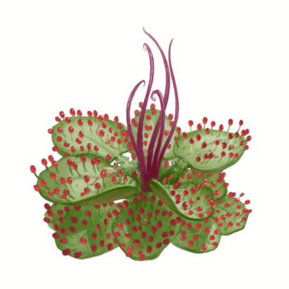 This plant is covered with dozens of clear tendrils,each tipped with a glistening red bulb. Whiplike fronds unfurl from the center.