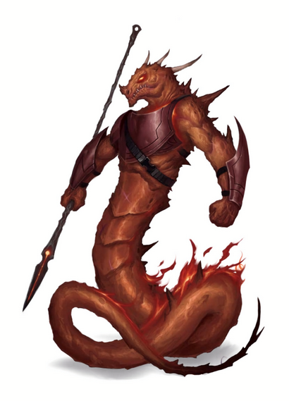 这长着蛇身的人型生物发出愤怒的嘶嘶声。劈啪作响的火苗像尖刺一般在它焦黑火红的鳞片上跃动。
