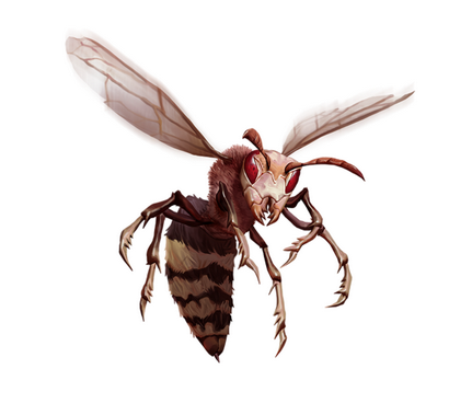 这马一样大的黄蜂全身被黄色和黑色条纹覆盖——它的钉刺和一把剑一样大,往下滴着毒液。