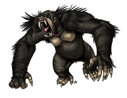 锋利的牙齿在这个巨大,凶猛的猿类口中,它那长而有力的手臂伸展到地面,手的末端是弯曲的爪子。