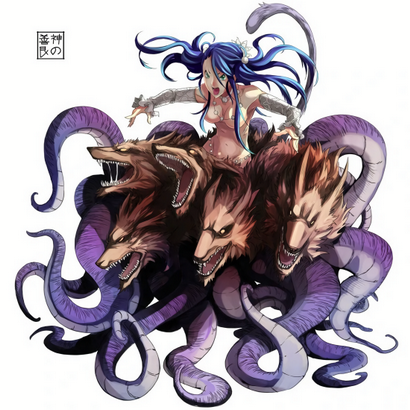 这位 JJ 住在卡律布狄斯隔壁,摩西拿海峡另一头,原意"撕裂"。她也曾经是水宁芙,起源的确是多种多样,最流行的说法她是美杜莎的姐妹,被格劳科斯(Glaucus)爱上。而女巫师喀耳刻(Circe)也喜欢格劳科斯。所以出于狗血的三角恋喀耳刻在斯库拉洗澡时往海里倒了瓶药水,就变这德行了。