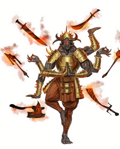 除了那些高高在上统治阿修罗族的独一阿修罗魔尊(Asura Ranas)以外,阿修罗王就是它们的族裔中最强大的那一批了。虽然大部分阿修罗王都喜欢以开疆扩土(在九层地狱或者其他什么地方)来彰显自己的荣耀,不过作为阿修罗族中的"觉慧者",这些高级的阿修罗贤者居住在它们神庙般的雄伟堡垒中,除了练习精进自己毁灭性的神秘技艺以外,阿修罗王还负责训导和指挥那些前来向它学习的次等阿修罗。等于大多数阿修罗来说,一个阿修罗王的命令几乎就相当于神谕般不可抗拒。