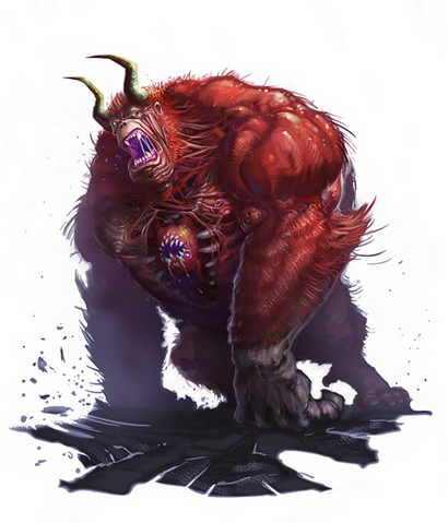 这头笨重的类猿怪物具有血红色的毛皮和扭曲的双角,在它的胸口正中有一个可怕的带牙孔洞。