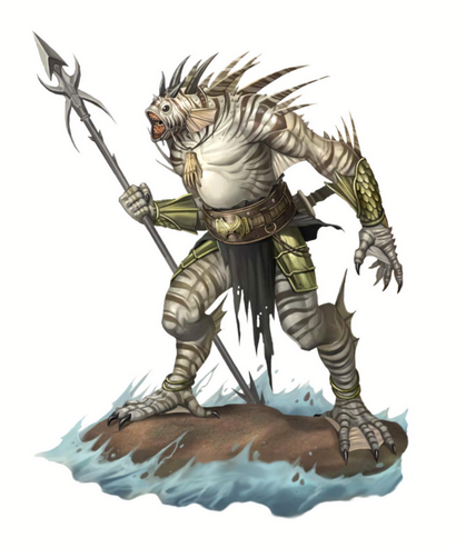 满心奸恶毒诈,鲉鳍妖会污染海洋并试图将毁灭带给居民。鲉鳍妖的外表是笨重的类人生物,史前鱼类和剧毒底栖鱼的混种。虽然大部分鲉鳍妖生活在咸水,他们有时也会传送到绿洲里污染或吸干当地居民。虽然他们把所有凡人看作敌人,鲉鳍妖对爱好和平的水中生物,像世人鱼或洛卡鱼人格外憎恨。