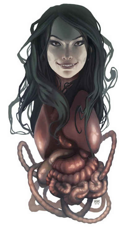 这个丑恶的飞颅鬼曾经是最令人毛骨悚然的吸血鬼畸形之一。飞颅鬼会在白天将自己隐藏成一名类人生物,但每当夜幕来临或是被人驱使时,这名生物的头颅将会从躯体分裂出去,她会将她的内脏从喉咙中拉出来,摇摇晃晃的将它们围成圈状,之后扑入夜色以寻求饱饮鲜血来满足她那邪恶的饥渴。