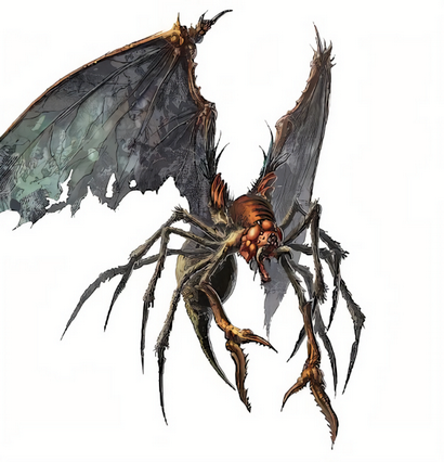 这只古怪的野兽看起来像是一只和马一样大小的黄蜂,但却有着蜘蛛的头部以及两条末端带蝥的细长腿部。