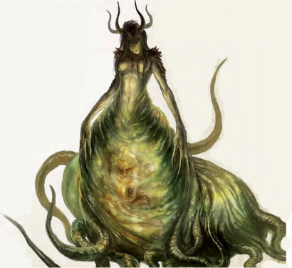 狂乱而难以操纵的原初生命之能,浸透着这诸怪物之母的身躯。她翻搅、扩张的腹部彷佛嘲弄着造物主,孵育了恐怖与黑暗的残次品。
