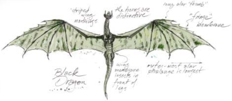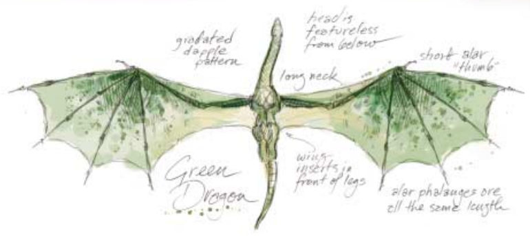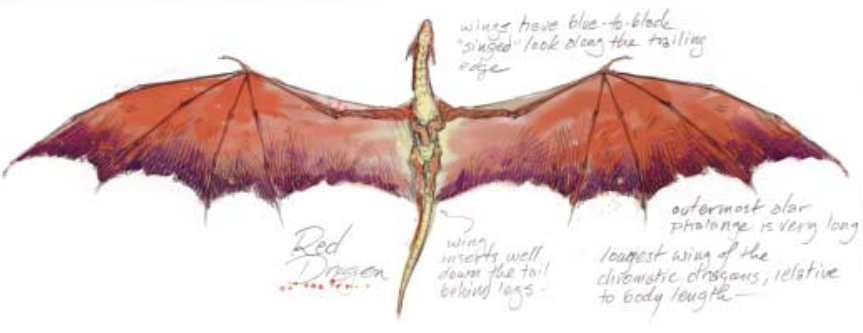 红龙有所有彩色龙中最长的翼,既是指实际测量值,也是指相对于体长的比例。这基本上是由于最外侧的翼指骨,它很长,而且给予翼以锥形的外表。翼最长的部分正是后缘。翼膜的后缘在后腿后面、尾巴下面很远的地方与身体相连。沿着后缘的翼是淡蓝或蓝黑的(龙的褶边表现出类似的图案);这种颜色类似于金属在火中燃烧的蓝色。