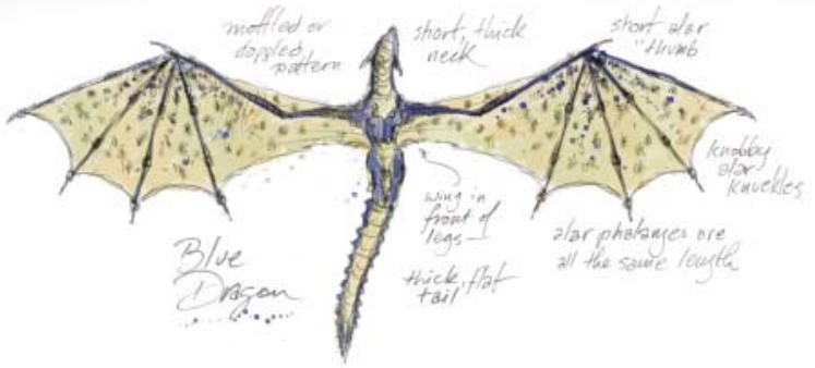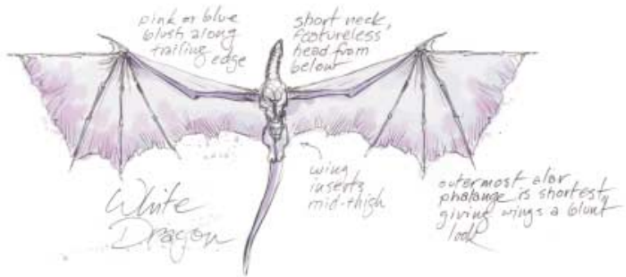 从下面看时,白龙展现出短脖子和没有特征的头部。它的翅膀的末端看起来是钝的。翼的后缘展现出粉或蓝的色调,翼膜的后缘与身体在后腿附近相连,大约在大腿中间处。