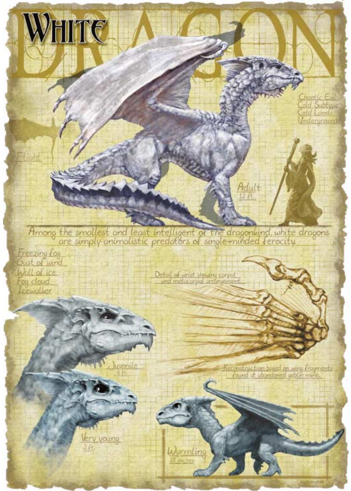 仅有普通智能的白龙却拥有非凡的记忆力。它们牢记着每个细节与成败,且以睚眦必报而闻名于世。它们通常也会因此冒犯与其在同一地区筑巢的银龙。白龙跟所有龙类一样以龙语交谈,但非必要时都很少说话。