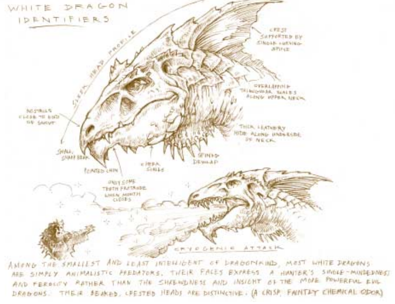 原始而记仇Primal and Vengeful:白龙缺少其他大多数类所具备的狡诈与战术思维。不过它们的野兽本能令其成为所有龙类中最好的猎人,并使其因此孤独的专注于求生和屠杀敌人。