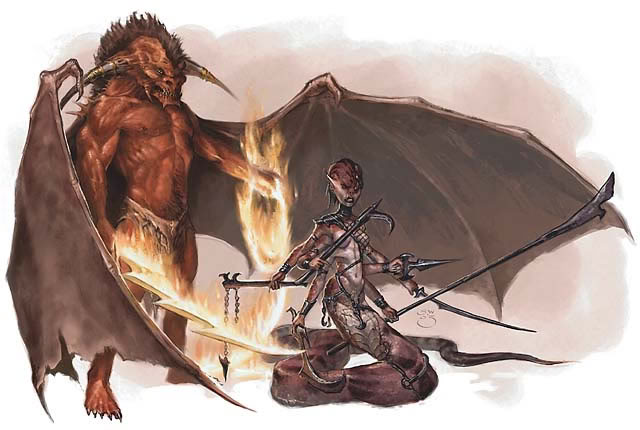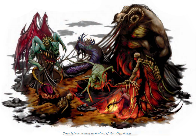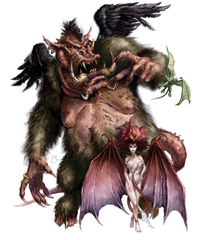 恶魔是一群产自无底深渊(无止境的邪恶位面)的生物。它们是凶残的拟人化并且会攻击任何生物只为以此为乐——甚至是其他恶魔。它们喜爱在杀害它们的受害者之前恐吓他们并且经常吞噬被杀者。许多恶魔,不满足于它们自己的不公正,享受诱惑凡人变得尽可能的堕落。