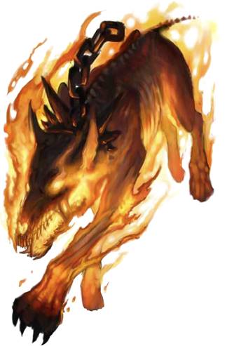 地狱犬是一种具侵略性、会吐火的异界犬类邪魔怪物。它们遍布修罗场的战场,乃至整个下层位面中。物质位面中的地狱犬通常都是服务于魔鬼、火巨人和其他邪恶生物,被用作动物守卫和伴侣。