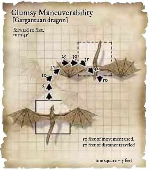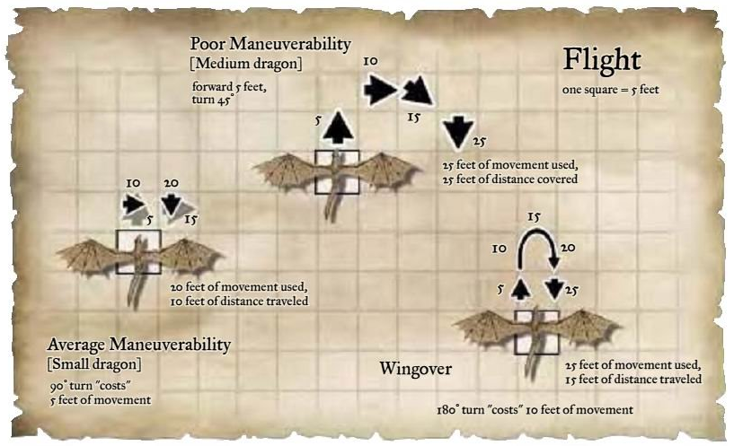 下面的飞行图解的一部分展示了一条中型龙进行180度转弯的过程。不良的机动性不允许这条龙在同一空间中转过45度以上,所以它转得弯更大。它向前移动5英尺,同时转过45度,沿斜线移动5英尺,同时转过另外45度,继续另外5英尺并转过另外45度,然后沿着另一条斜线移动,这视为10英尺(对于第二条斜线),并完成转弯。它使用25英尺的速度来转弯。