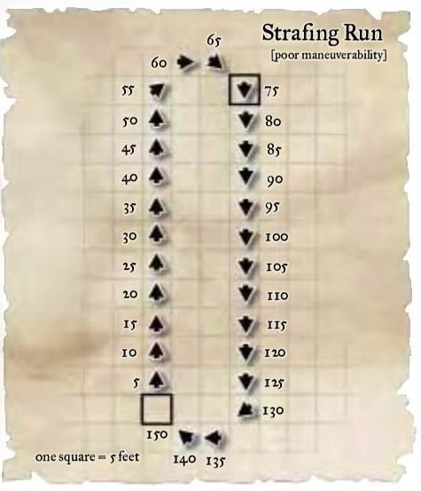 空中扫射(Strafing Run)(不良机动性)图解展现了一条中型龙沿着20英尺宽的峡谷前后移动、使用飞越攻击以在飞行的同时骚扰地面上的敌人的轨迹。如果这条龙有150英尺的速度,那么它有两个选择:它能缓慢地飞行,同时维持它75英尺的最小向前速度,每回合经过它的敌人一次,两次之间在标有75的位置结束。另一次选择是,它可以用全速飞行,两次经过它的敌人(然而它只能攻击一次),并在开始的地方结束,下一回合在原位以同样的模式进行。