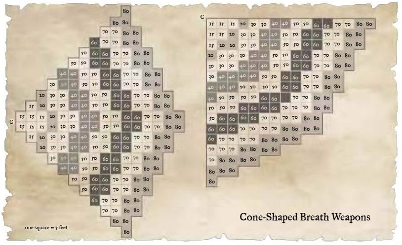 下一页上的锥形喷吐武器图解阐明了锥形的喷吐武器在5英尺格子的方格网上的尺寸和形状。