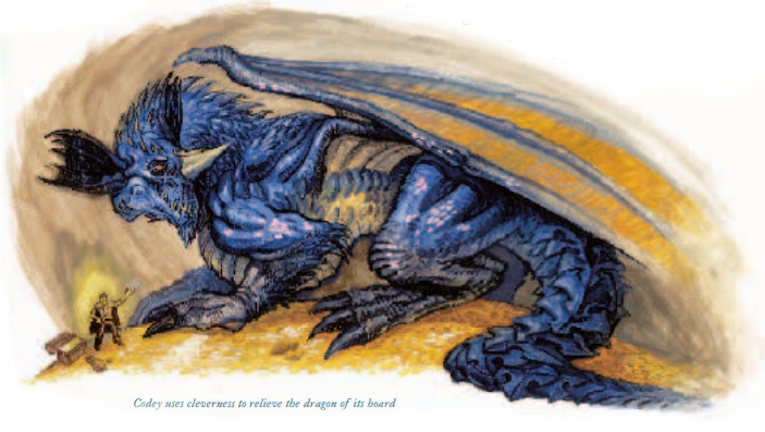 曾经有一位名叫科迪·轻足的半身人冒险者。他与不同种族的同伴一同经历了多年的冒险,有很多惊险的故事可讲,但他从未获得过龙的宝藏,而这个事实令他很不满。他与他的冒险同伴——两个名叫赫尔利和芒罗的矮人,以及一个叫罗顿的人类——交谈,并告诉他们自己的计划。他们同意了他的计划并带上了一些油漆,刷子,弹珠,镐子,铁锹,一些魔法药水,几剂巫妖之尘,武器以及一些食物和水。然后他们出发前往沙漠寻找科迪曾经听说的蓝龙的巢穴。他还听说这只特别的龙的鳞片不如其他蓝龙一样光亮。