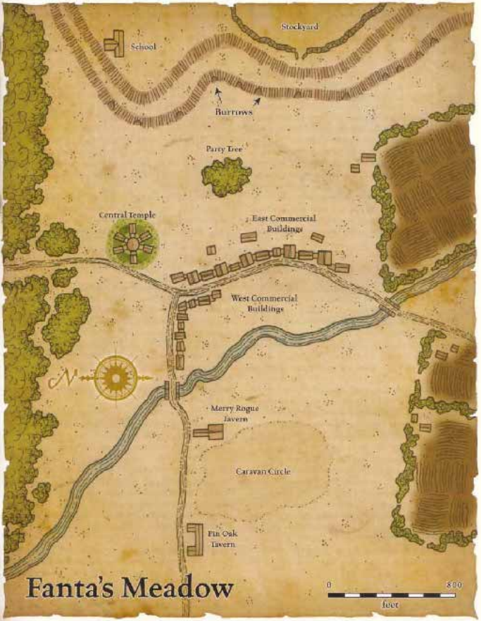芬塔草甸坐落在占地四十亩的草地上,毗邻几个农村地区的人类农场。一条小溪穿过草甸的南半部,为半身人种植的庄稼和果园供水。这里土壤肥沃,并且大约四分之一的土地由天然树林覆盖。岩石山脊沿着建筑群的北侧延伸。