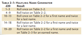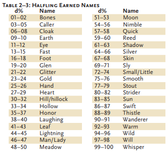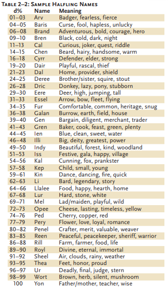 每个半身人名字由一个或多个名称片段(来自表2-2)和可能的赋名(来自表2-3)组成。组合两个半身人名称片段时,经常在它们之间添加“o”或“Ee”。女性半身人的名字有时会使最后一个辅音双写并添加一个“-a”(因此,Furgren变成了Furgrenna)。如果你不喜欢特定组合,请尝试在名称片段之间添加“a”,“i”或“y”,或在末尾添加“-En”或“-Enna”。并非所有名称片段的组合听上去都合适;如果一个特定的名字听上去并不好,尝试创造一个具有类似含义的名字。
